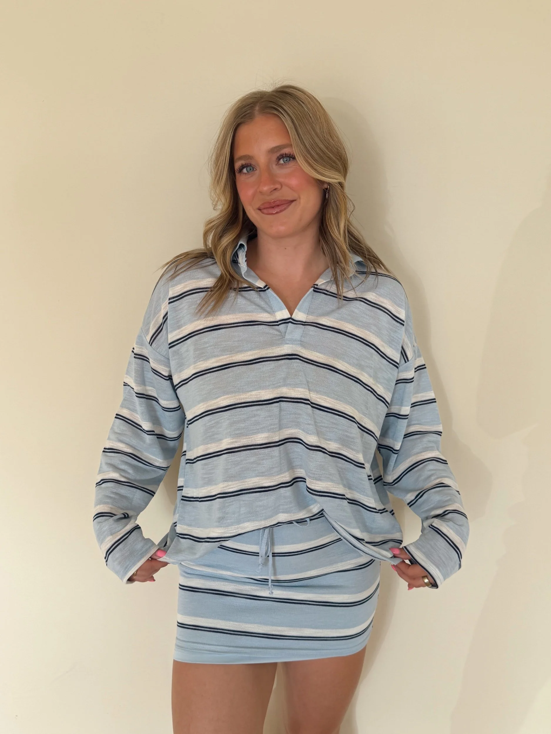 The Carson Set is easy, playful, and effortlessly chic. Made from sheer, lightweight knit, this matching set features a long, loose-fit striped top with a thick collar and a coordinating mini skirt with an elastic waistband and drawstring tie.