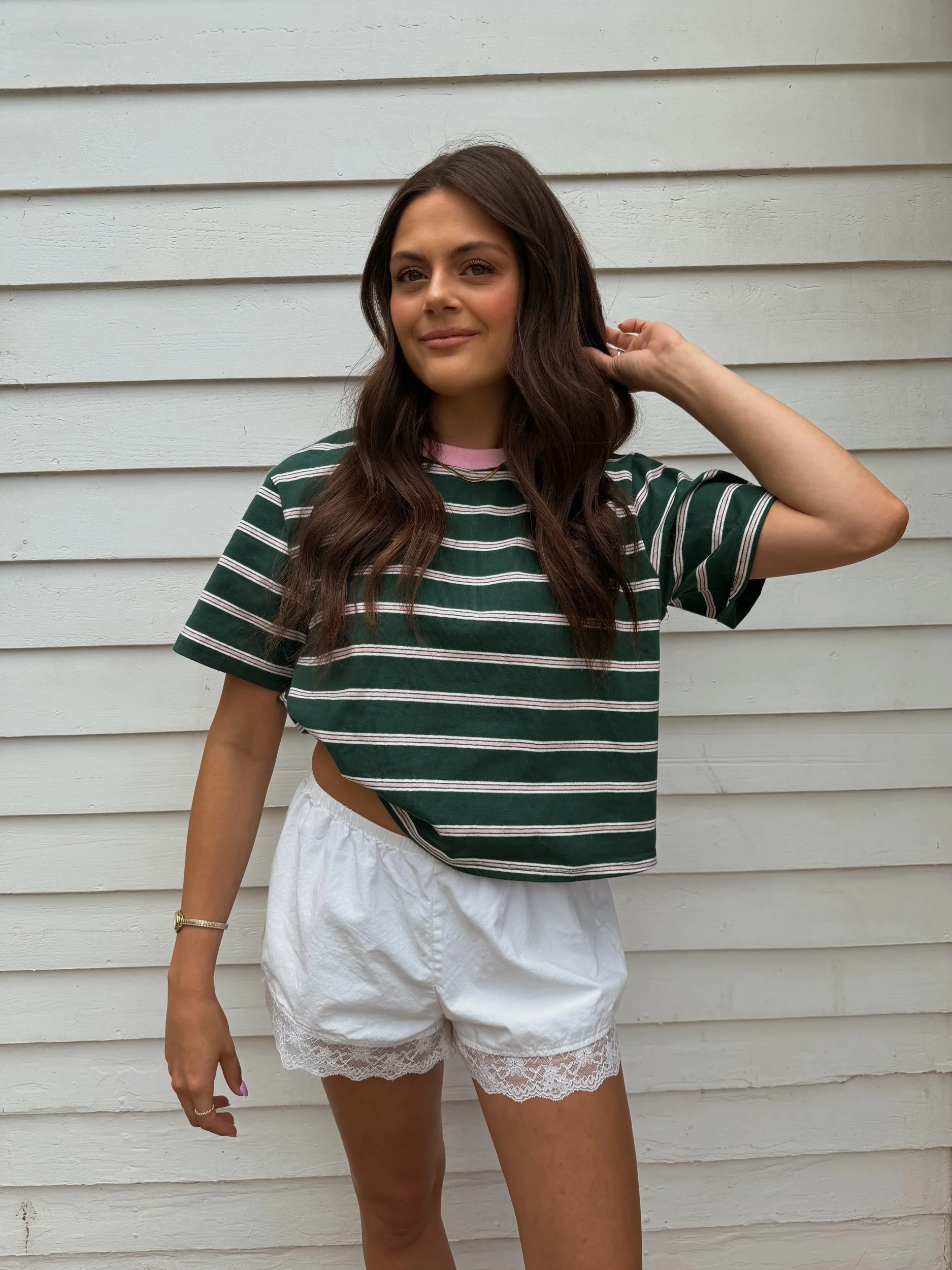 Fresh, fun, and perfect for sunny days, the Watermelon Striped Tee brings a playful pop of color to your casual wardrobe. Featuring a vibrant green base with contrasting pink stripes, this boxy cropped tee delivers a relaxed, on-trend silhouette that pairs effortlessly with your favorite high-waisted bottoms.